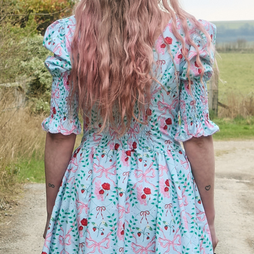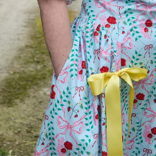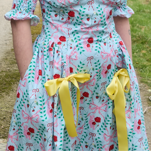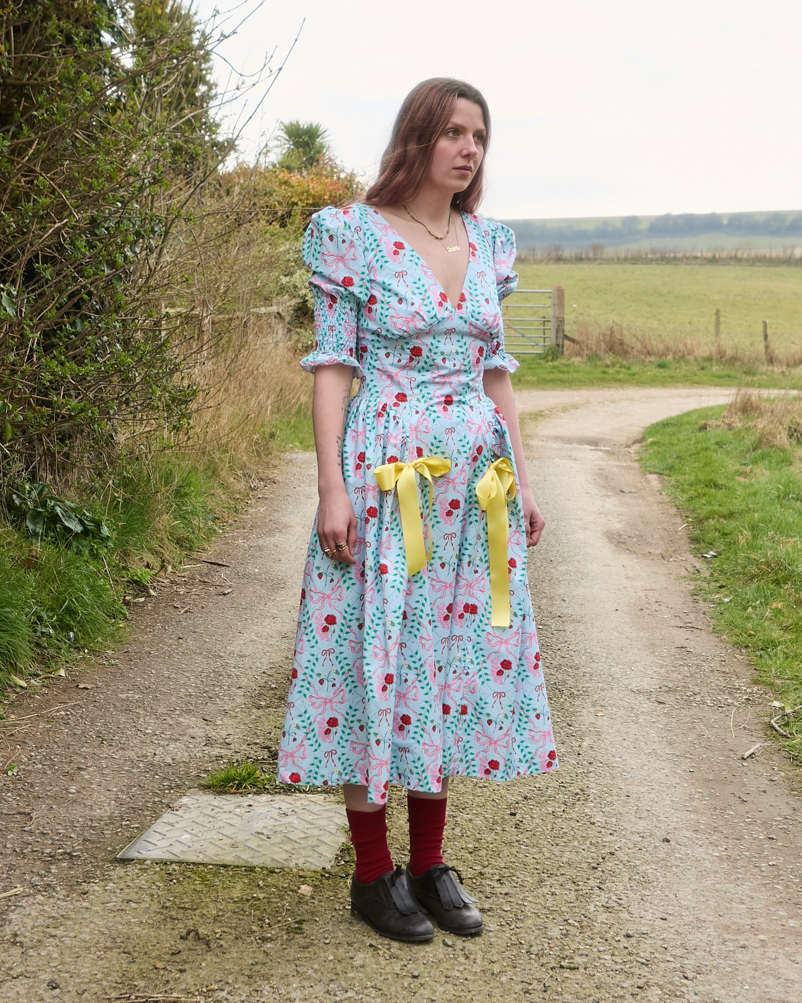 Midi dress in picnic print cotton with lined v-neck bust panel, corset style bodice and dropped waist silhouette. Features a gathered skirt with side pockets, pearl ribbon bows, a shirred back panel and shirred sleeves with pearl scallop embroidered cuffs. YKK invisible zip closure on side seam.