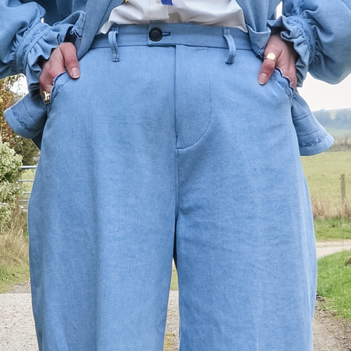 A high waist pair of tailored barrel trousers in organic pale blue denim. Features jean pockets, zip fly, partially elasticated waistband, back pocket, belt loops and button closure. Finished with dark blue lily of the valley and scallop hand-guided embroidery on the pockets and hem.