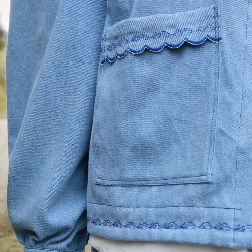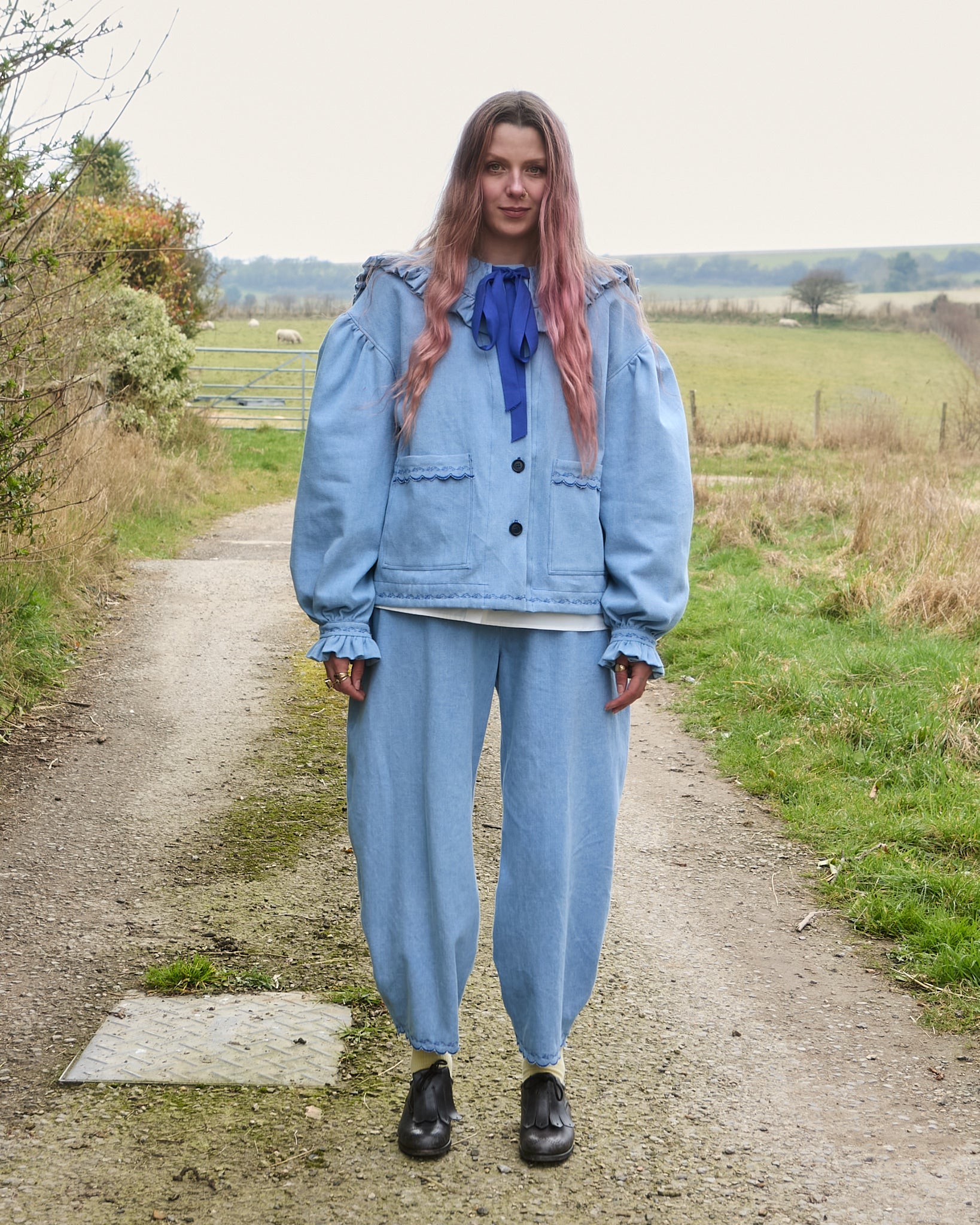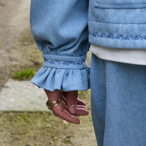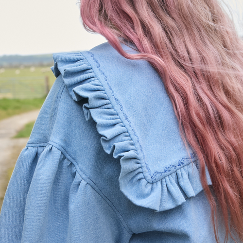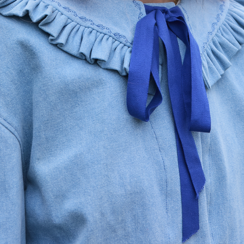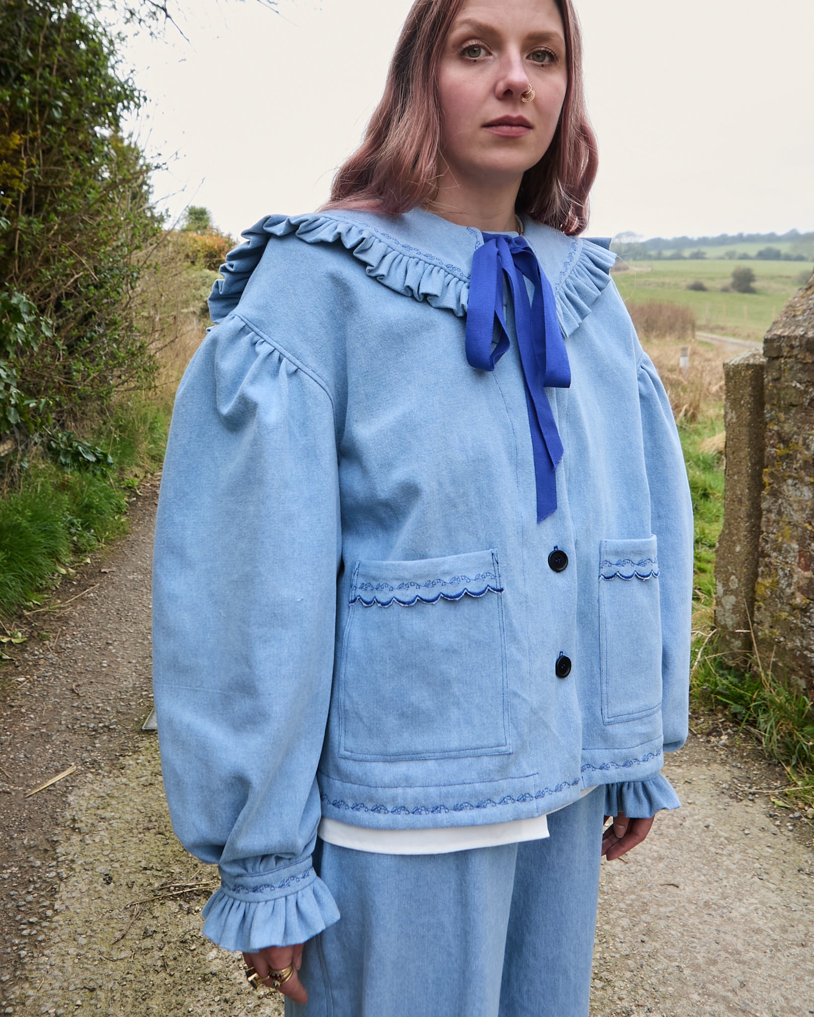 An oversized denim jacket with a dropped shoulder, puff sleeve and embroidered patch pockets. Featuring a frill sailor collar and cuffs finished with dark blue lily of the valley hand-guided embroidery and a dark blue cotton herringbone ribbon closure. Button front closure with eco-friendly corozo buttons.