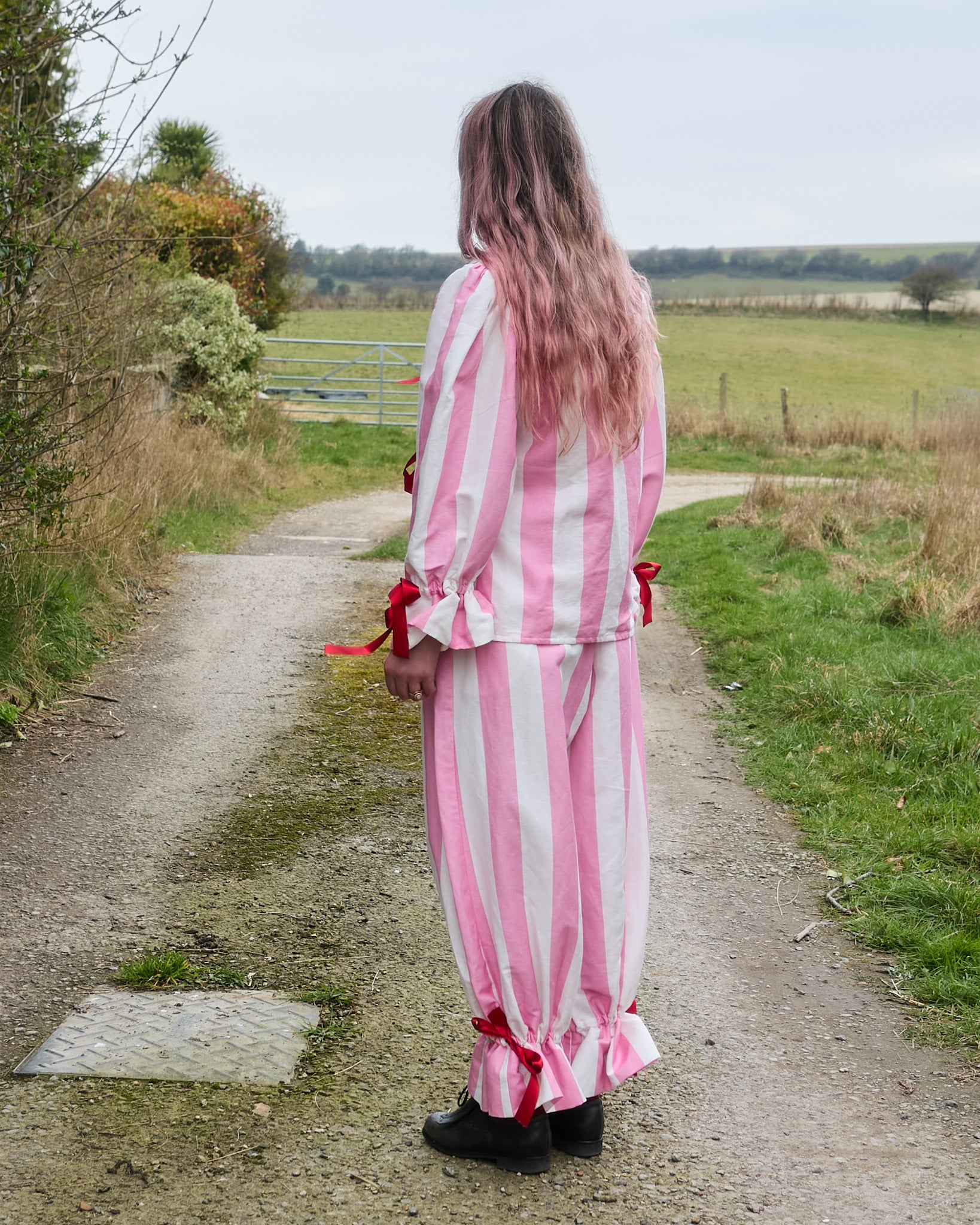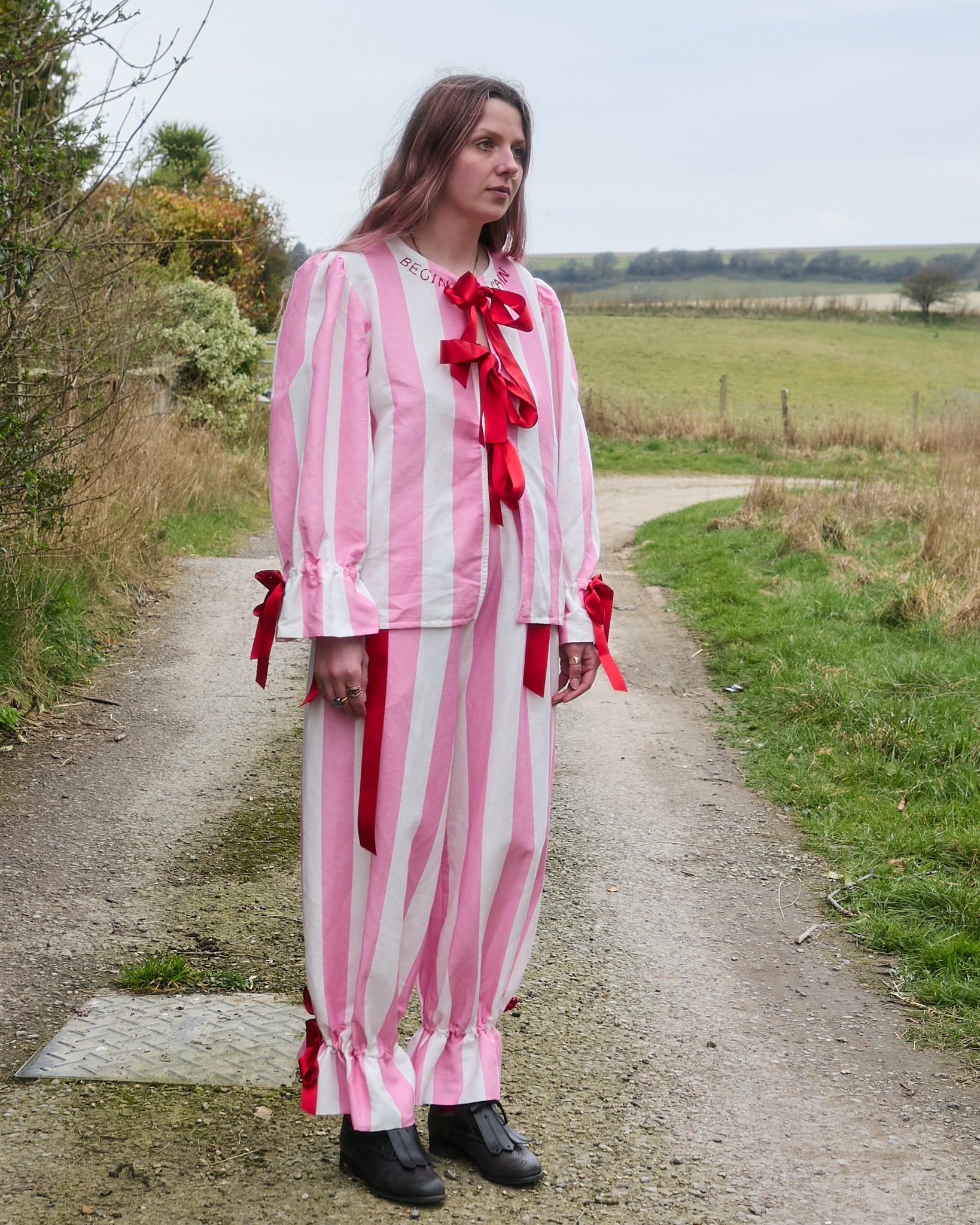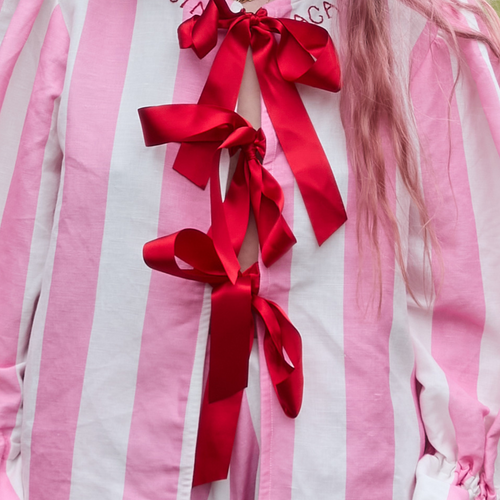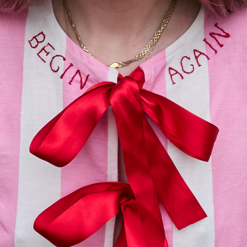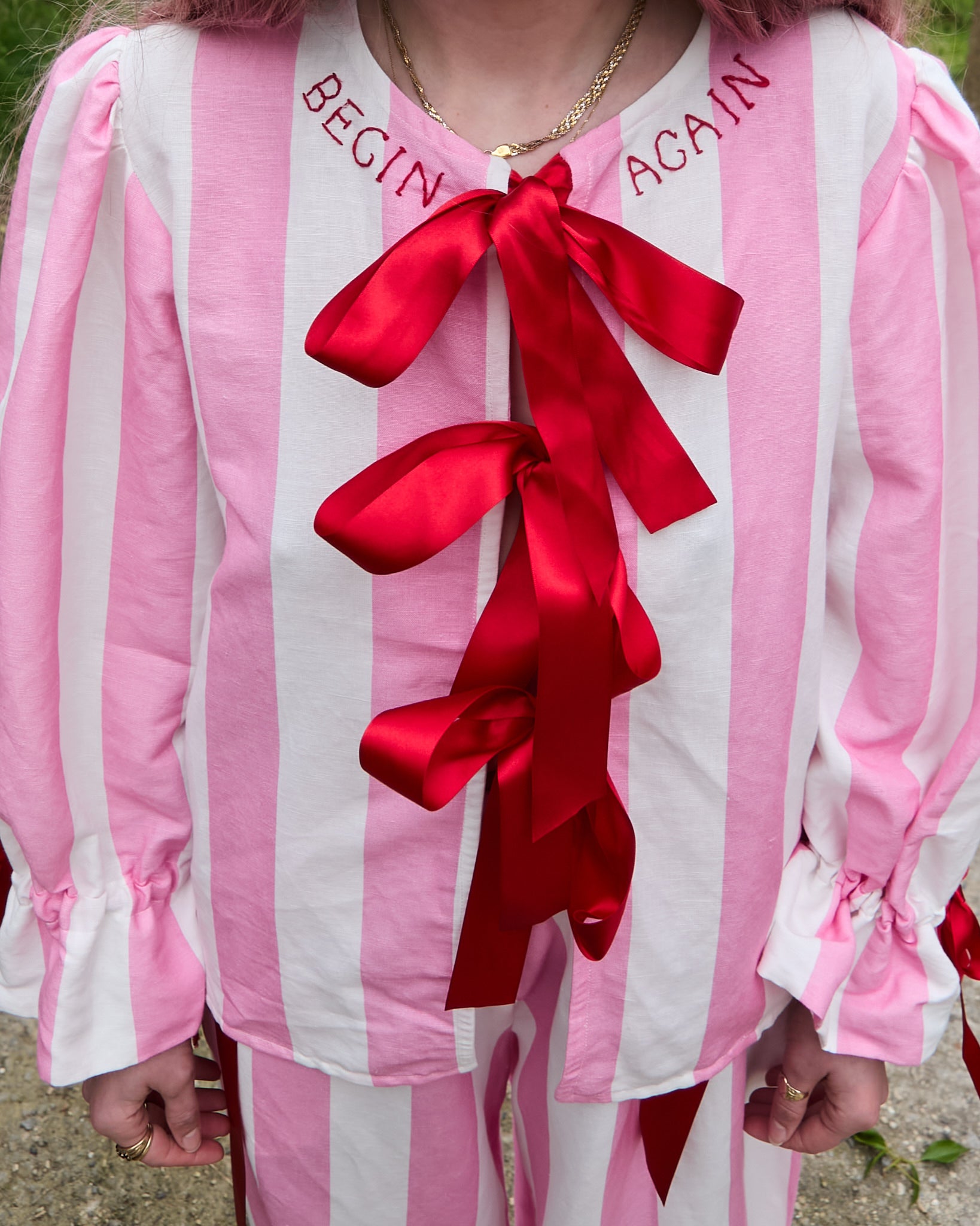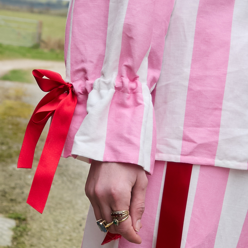 A loose-fit blouse with balloon sleeves in pink and white circus stripe organic cotton/linen with optional "BEGIN AGAIN" red hand embroidery at the neckline. Featuring red ribbon drawstring closure on cuffs. Finished with bias bind edging and three red ribbon ties on the front.