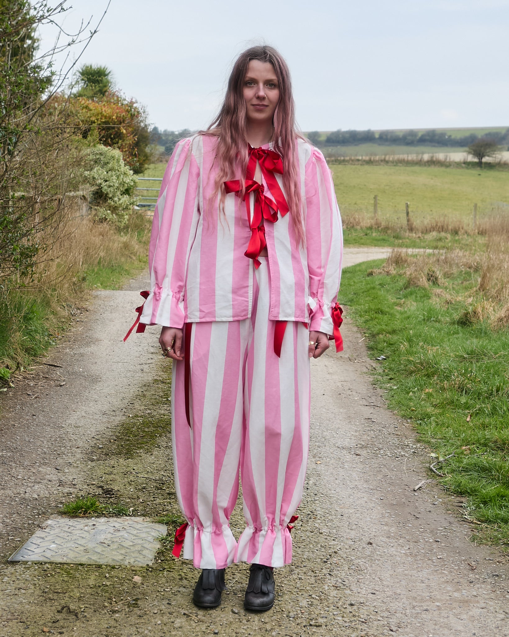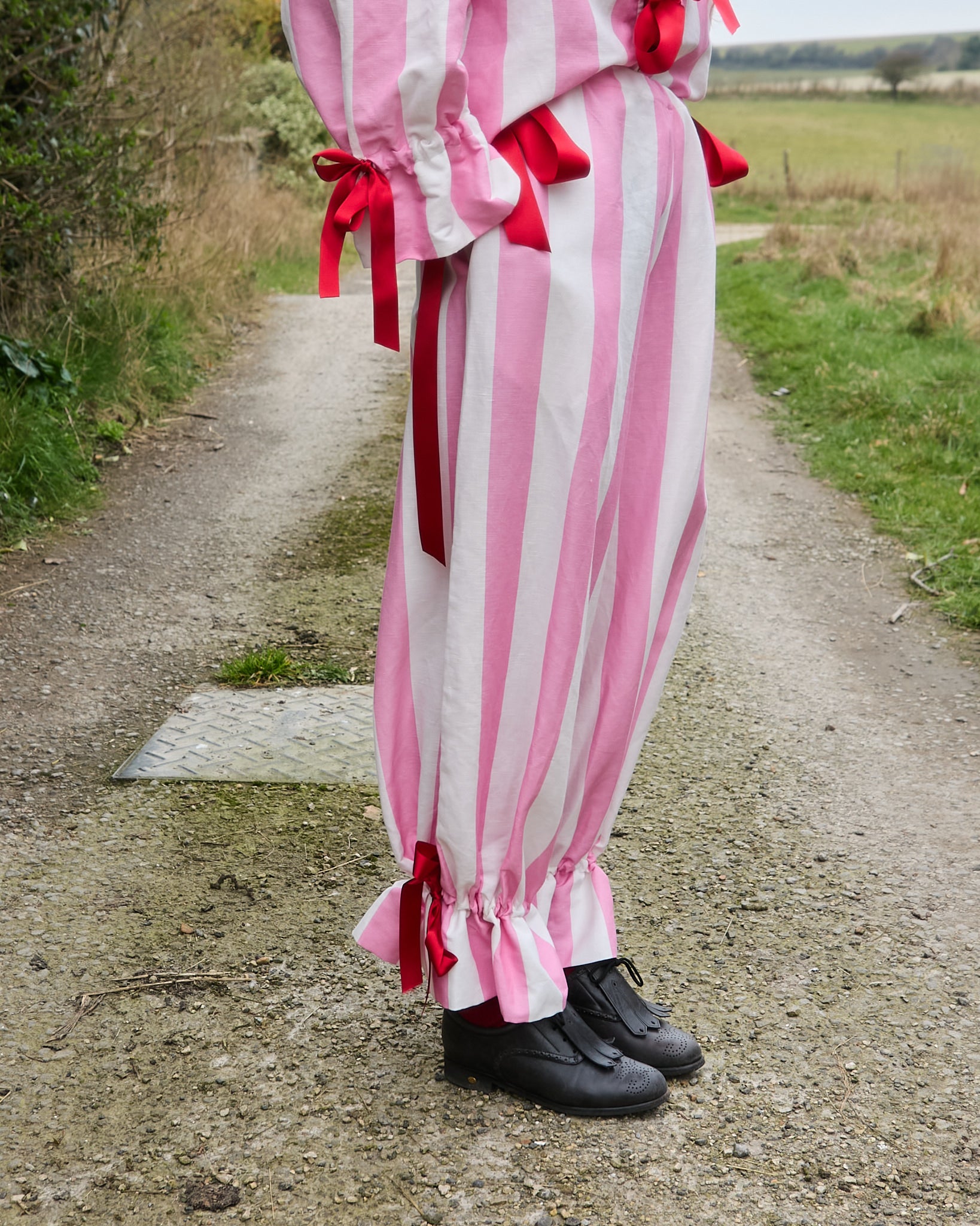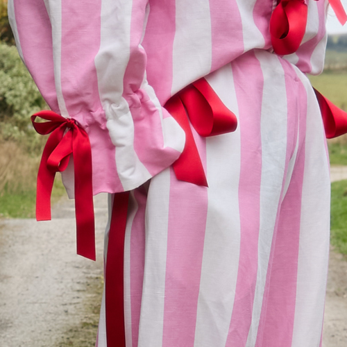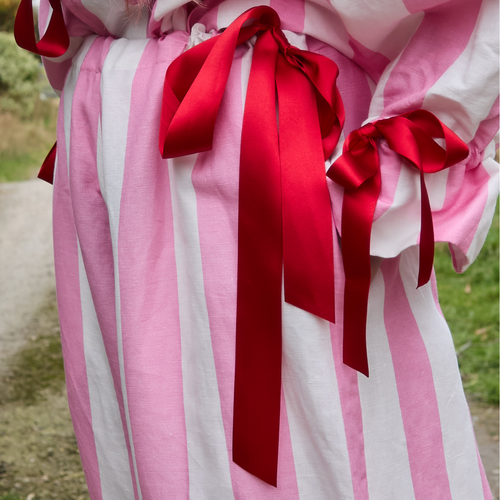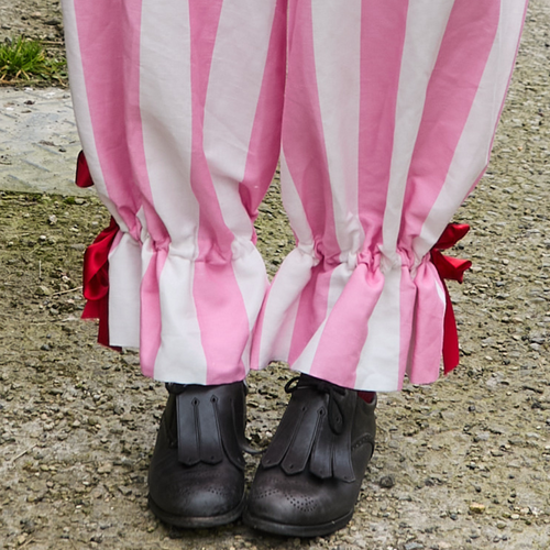 Long drawstring bloomers in pink and white circus stripe organic cotton/linen with side pocket. Two drawstring closures at each side seam on the waist, and drawstring on calf to create ruffle hem, all with cherry red ribbons.