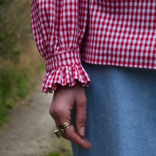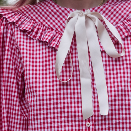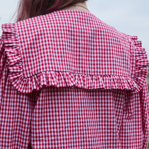 A blouse with balloon sleeves in organic red gingham cotton. Featuring a frill sailor collar with pearl ribbon tie and frill cuffs. Button front finishing with eco-friendly corozo buttons.
