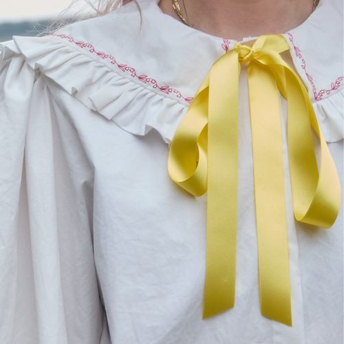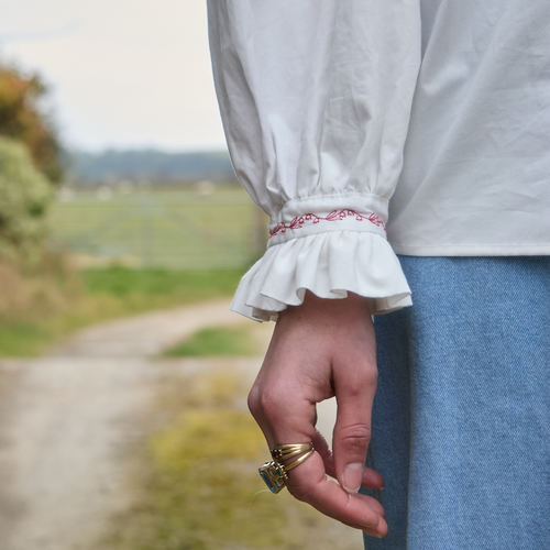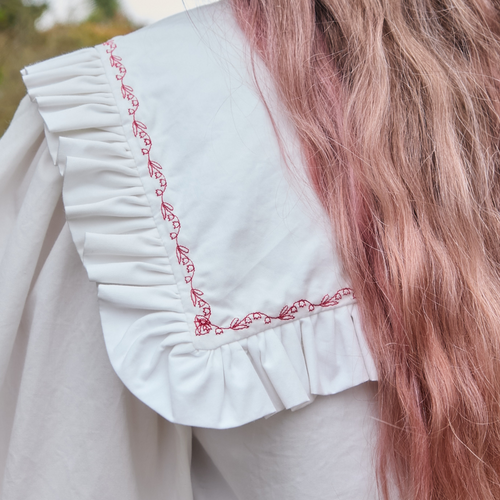 A blouse with balloon sleeves in white organic cotton with red hand-guided lily of the valley embroidery. Featuring frill sailor collar with buttercup yellow ribbon tie and frill cuffs. Button front finishing with eco-friendly corozo buttons.