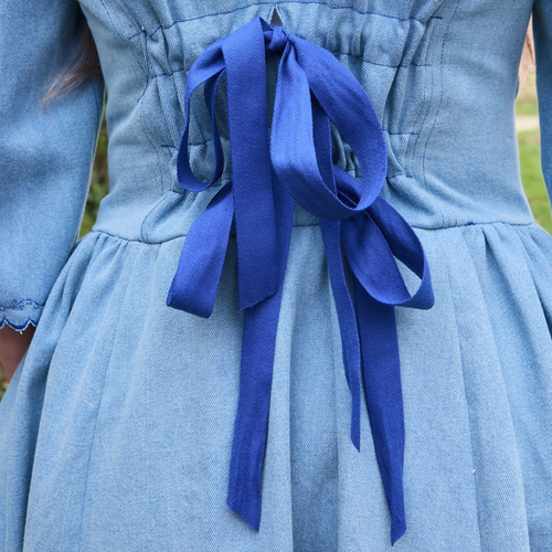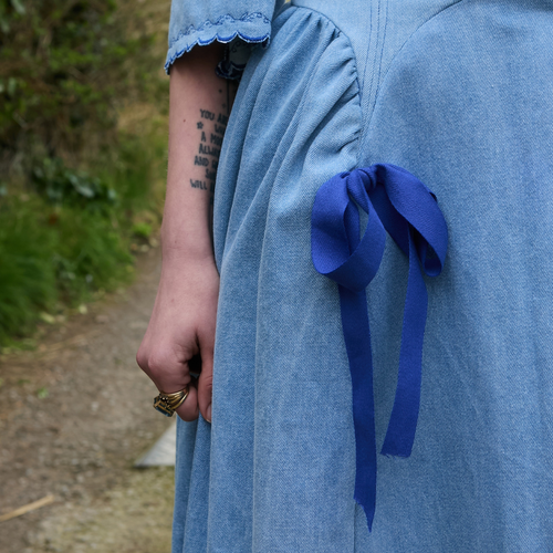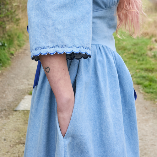 Midi dress in pale blue denim with lined v-neck bust panel, corset style bodice and dropped waist silhouette. Features a gathered skirt with side pockets, cobalt blue herringbone ribbon, a drawstring back panel embroidered cuffs and hem. YKK invisible zip closure on side seam.