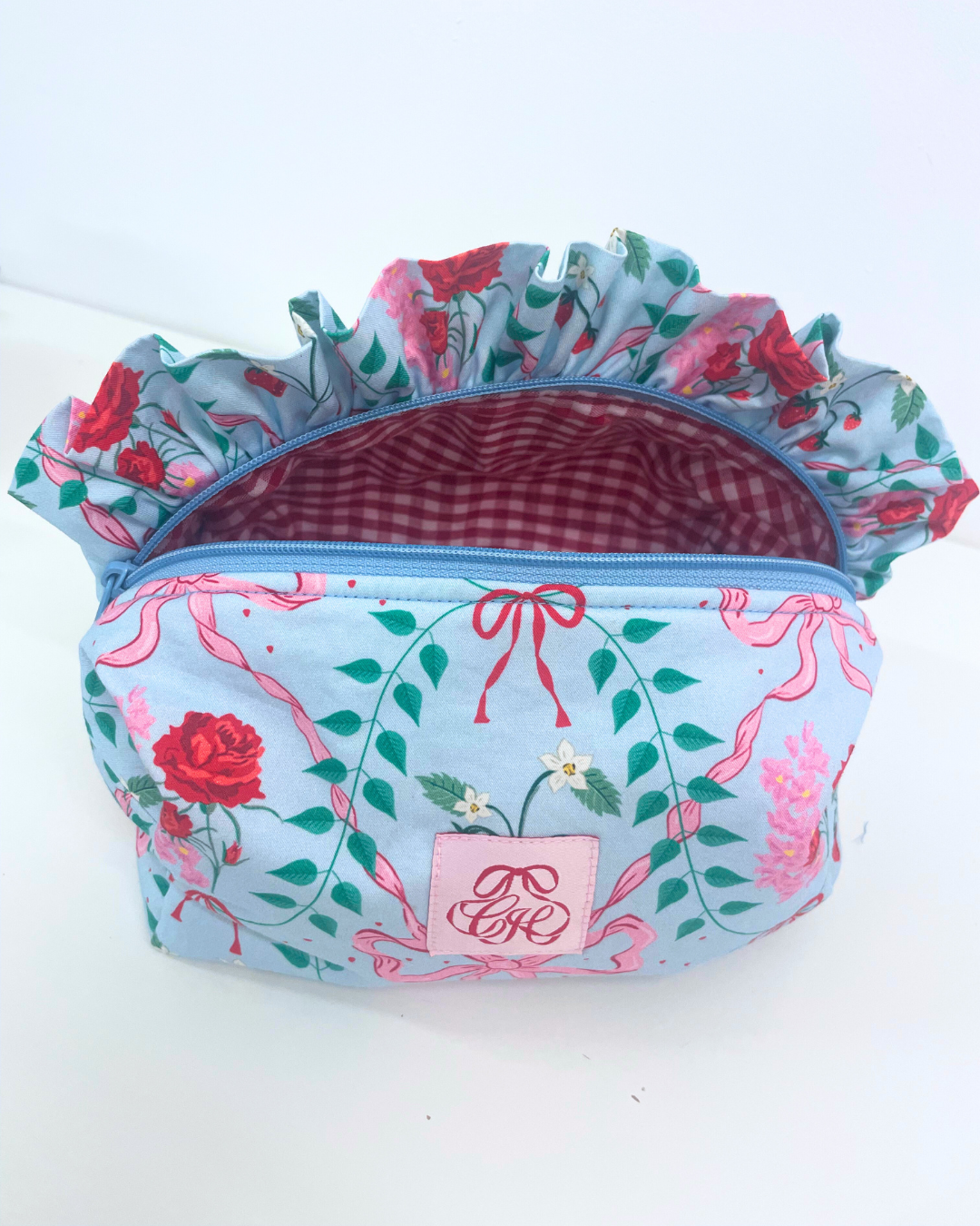 An quilted pouch bag with frill, fully lined and finished with a YKK zip. Can be used as a wash bag, make up bag, bag for your Sylvanian Family figurines etc.